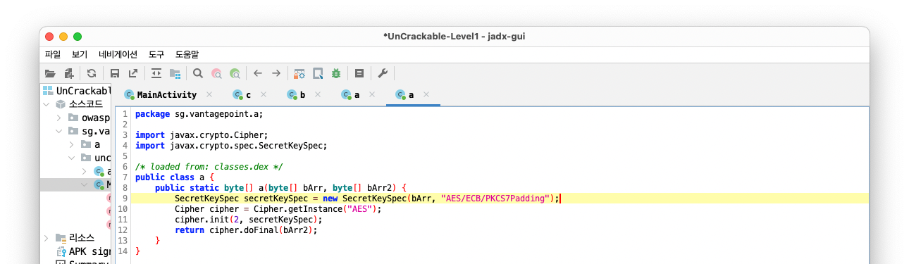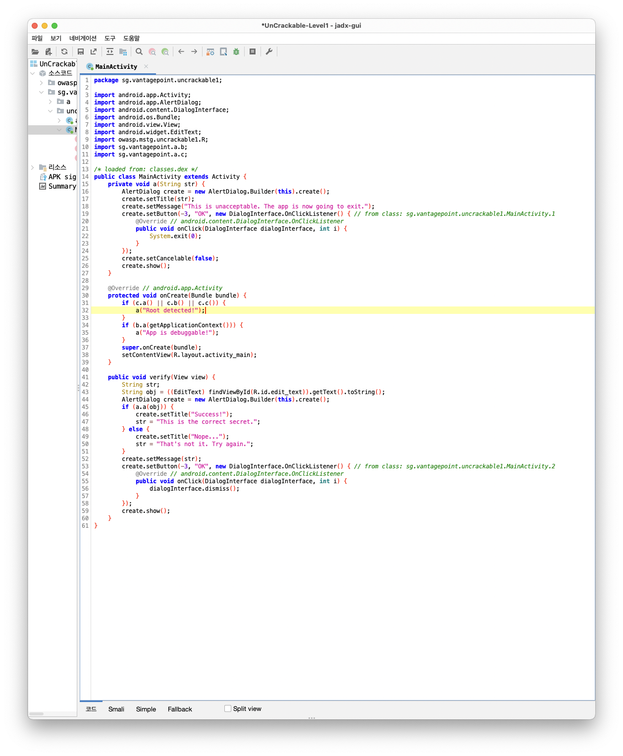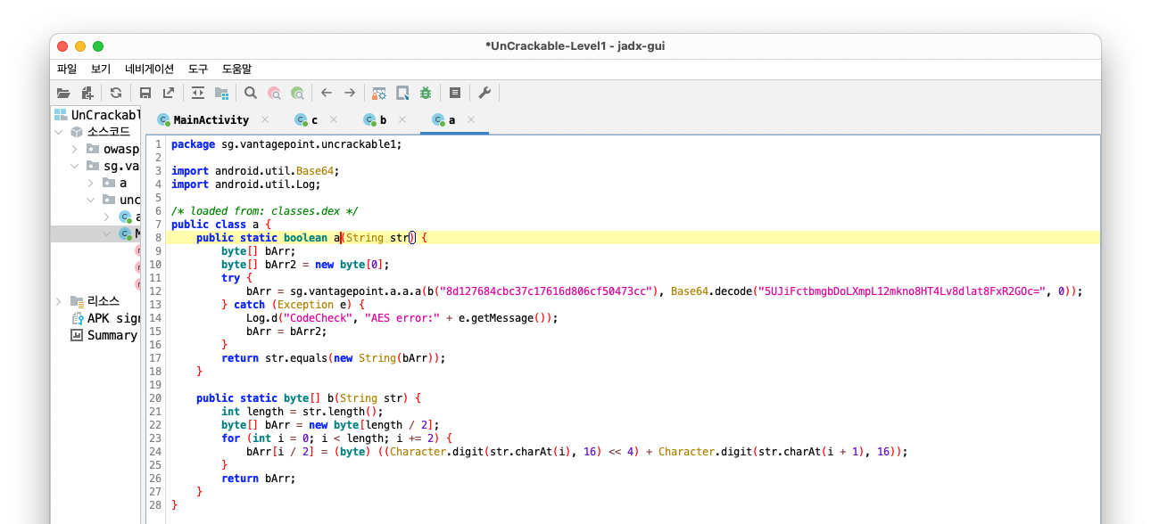 jadx-gui UnCrackable-Level1.apk --show-bad-code