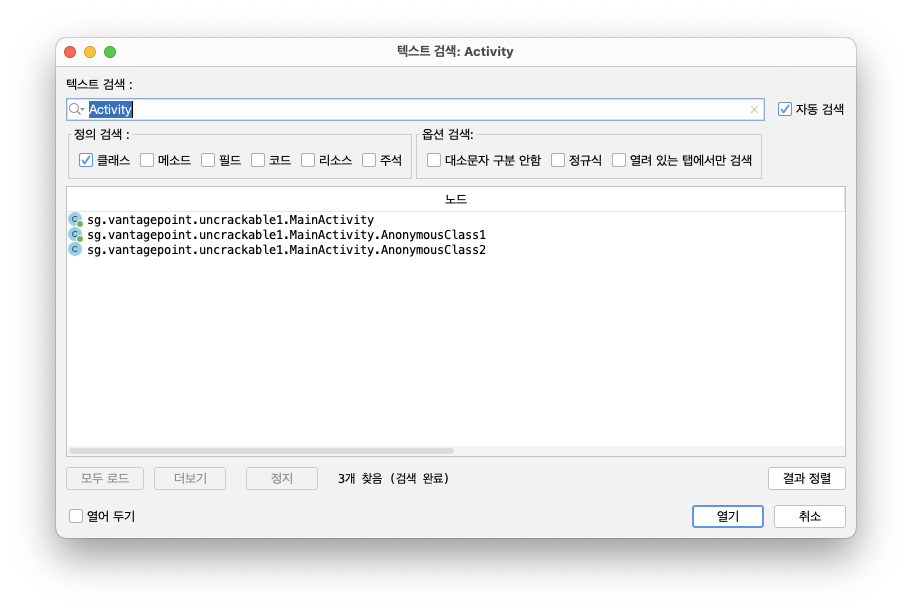 네비게이션 > 클래스 검색(Cmd-N) 메뉴에서 Activity를 검색합니다