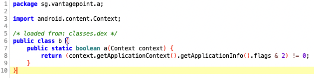 코드를 확인해보니 ApplicationInfo의 플래그에 FLAG_DEBUGGABLE이 포함되어 있는지 확인하는 코드였습니다