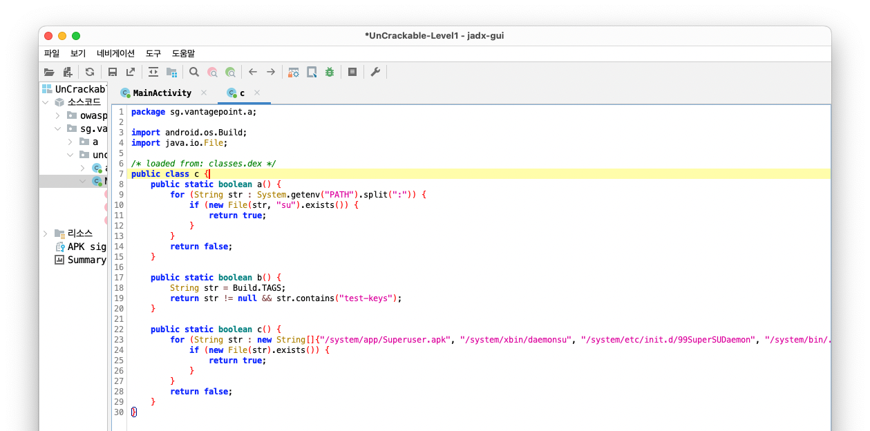 먼저 루팅 탐지부터 우회해야 하겠네요 jadx를 사용하여 정적 분석을 시도합니다