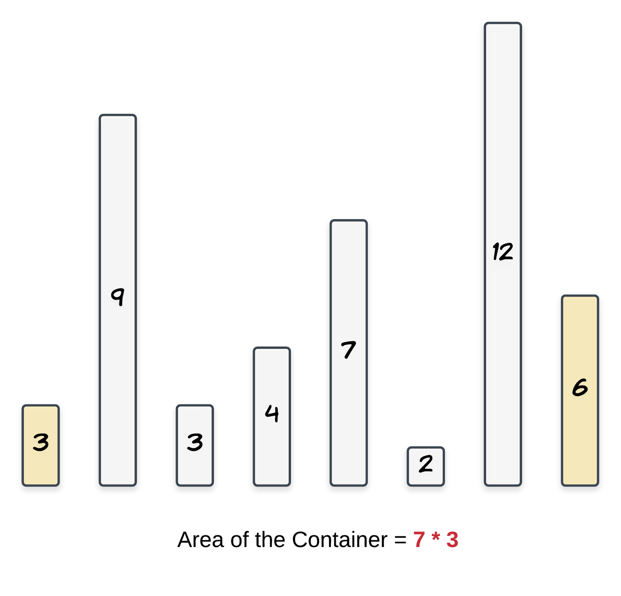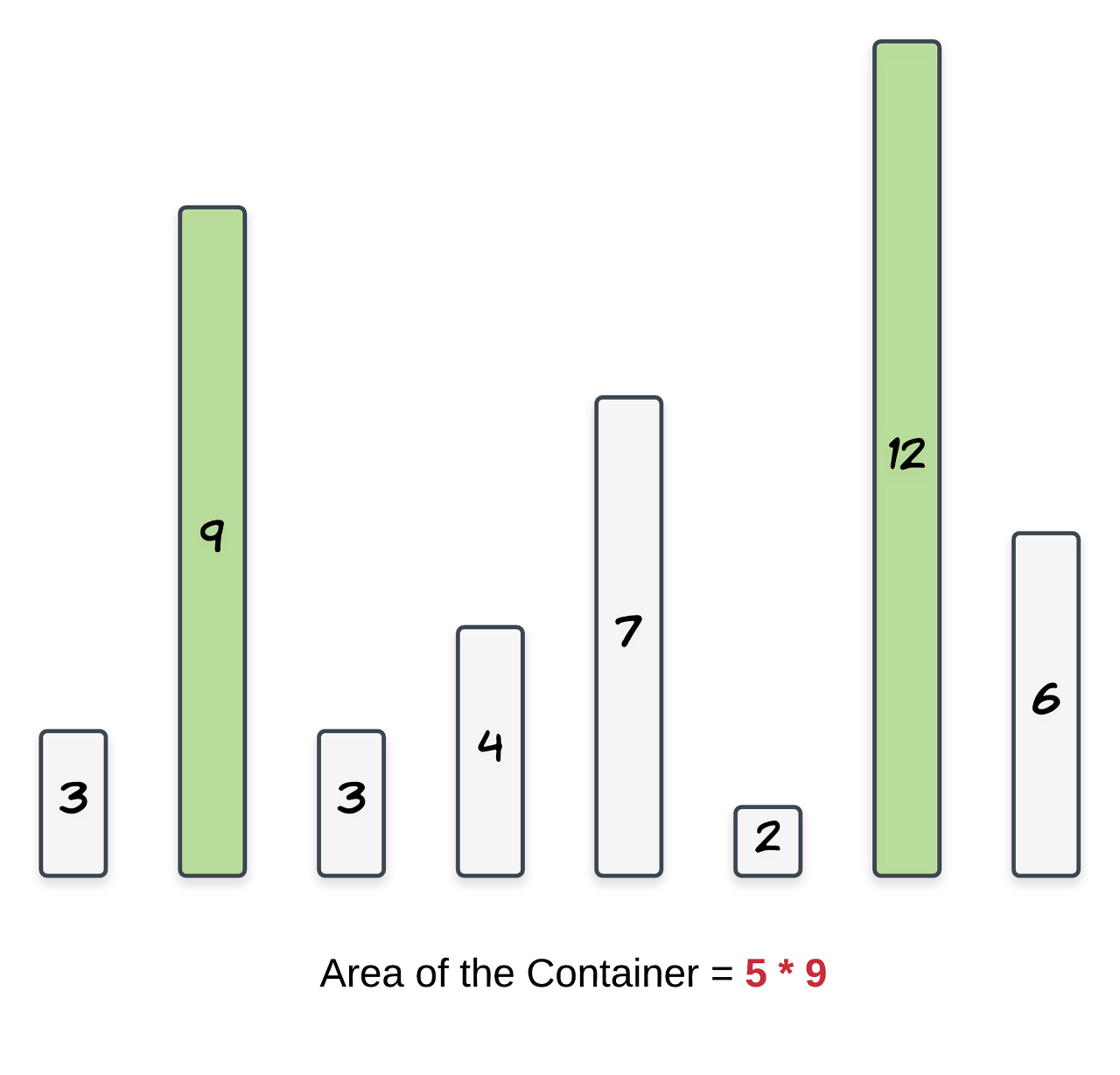 목표는 수직선 사이에 형성된 면적을 최대화하는 것입니다. 컨테이너의 면적은 더 짧은 선을 길이로, 선 사이의 거리를 직사각형의 너비로 사용하여 계산됩니다.